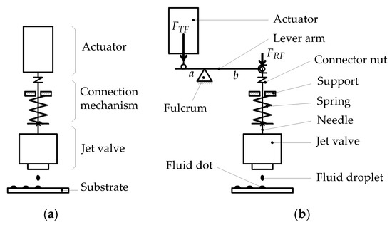 Jet dispenser models. (a) Direct actuating; and (b) lever arm and fulcrum structure.