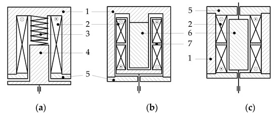 Basic configurations of electromagnetic actuators. (a) Solenoid actuator (SA); (b) moving coil actuator (MCA), and (c) moving magnet actuator (MMA). 1. Iron shell/frame; 2. coil; 3. spring; 4. plunger; 5. flange; 6. magnet; and 7. coil holder.