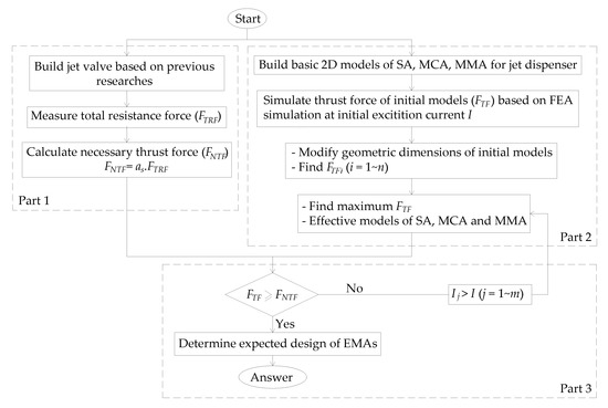 Figure 3 shows the main steps and procedures in the actuator design and evaluation process performed in the present study. As shown, the framework consists of three parts. In the first part, an experimental model of the jet valve is constructed to measure the total resistance force acting on the needle, FTRF, and evaluate the minimum value of the thrust force which each actuator must therefore produce (referred to henceforth as the necessary thrust force, FNTF). In the second part, numerical models of three simplified 2-D SA, MCA, and MMA models are constructed based on the dimensions proposed. FEA simulations are performed to determine the thrust force, FTF, produced by each actuator when excited by a fixed electric current (referred to as initial excitation current, I). The geometric dimensions of each model are then modified in such a way as to generate a maximum thrust force corresponding to effective SA, MCA and MMA models. In the third part, the minimum excitation current, Ij, found to satisfy the thrust force, FTF, generated by the modified models will be greater than or equal to FNTF. Finally, the actuation performance and thrust force magnitude of the three modified actuators are evaluated and compared and preliminary designs for the corresponding actuator-driven jet dispensers also prepared.
