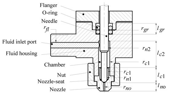 Before designing the SA, MCA, and MMA actuators, an experimental model of a jet valve was constructed to determine the magnitude of the necessary thrust force. In constructing the model, the design dimensions were referenced directly from previous studies in order to reduce the design time [14,43]. The jet valve configuration is shown in Figure 4, in which the main geometric dimensions are listed in Table 1 [12]. Note that the other dimensions of the valve that do not affect the flow rate or jetting process of the dispensed liquid (e.g., adhesive) were simply selected in such a way as to facilitate a straightforward assembly of the jet valve parts and the subsequent integration of the jet valve with the actuator and dispenser holder. The nozzle and needle were both fabricated of S304 stainless steel, while the flange, fluid housing and nut were made of Al6061 aluminum alloy. Finally, the jet valve was fitted with commercial Misumi O-rings (NPB No. 3).
