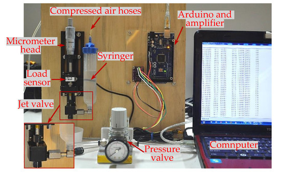 Figure 5 presents a photograph of the experimental setup used to measure FTRF. It is noted that the inertia force, FM, cannot be identified directly using this experimental model since the needle velocity needs to be calculated separately. Thus, FM was calculated separately and then simply added to the sum of determined experimentally. The experimental setup was built around a ZNHBM-10 kg load sensor positioned in such a way that the sensor head contacted the tail of the jet valve needle. A Mitutoyo micrometer with a range of 0–25 mm was used to adjust the needle position to obtain a stroke length range of 0–0.5 mm. The dispensing trials were performed using glycerol with a viscosity of 950 cp of Shimakyu Chemical Co., Ltd. Moreover, the compressed air was supplied by a standalone compressor (Model: SVU(P)-203 manufactured by Tong Cheng Iron Works Co., Ltd. (Taichung, Taiwan)) and was passed through a pressure valve (Model: MAR200-8A-2K manufactured by Mindman Industrial Co., Ltd. (Taipei, Taiwan)) in order to maintain constant backpressure on the adhesive surface. An HX711 analog-to-digital converter provided by SparkFun Electronics (Colorado, United States) was used to amplify the signal received from the load sensor and then send it to an Arduino board for processing. Finally, the Arduino board was connected to a laptop to visualize the measured load data. The measurement results showed that the total resistance force acting on the needle (excluding the inertia force, i.e., ) was equal to 3.6, 4.3, 4.8, 5.4, and 6 N for backpressures of 0, 0.5, 1, 1.5, and 2 bar, respectively.