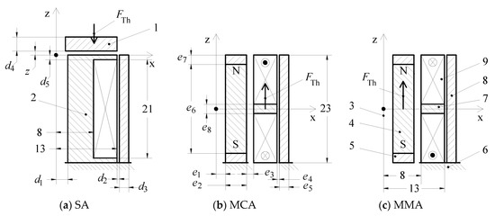 As described in the following, the electromagnetic force along the z-axis of the SA, MCA, and MMA considered in the present study are investigated by means of finite element analysis (FEA) simulations.