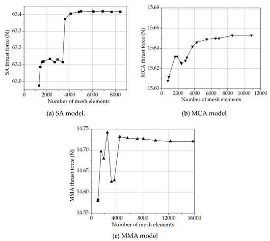 Figure 10 shows the convergence plot of the thrust force by varying the mesh density in each case given an excitation current of 2A at the initial position of z (0.2 mm for SA and 0 mm for both MCA and MMA). The thrust forces generated by SA, MCA, and MMA models start to reach a good convergence when mesh element numbers are higher than 5000, 8000, 8000 elements, respectively. Accordingly, the thrust forces approximately converge at 63.42, 15.65, and 14.72 N for SA, MCA, and MMA, respectively. Although a higher mesh density enhances the accuracy of predicted thrust forces, it significantly increases computation time. Consequently, the number of mesh elements mentioned above for each model is reliable enough and is used for setting mesh operations in the next simulation steps.