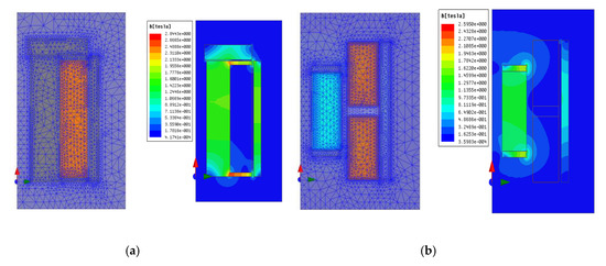 Meshed geometry and magnetic field distribution of models after modification. (a) SA model with 5118 mesh elements, and (b) MCA and MMA models with 8612 mesh elements.
