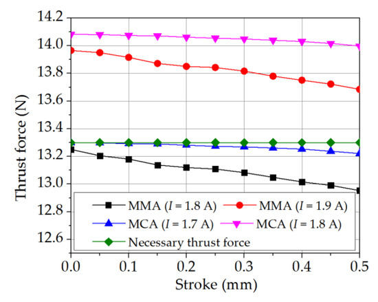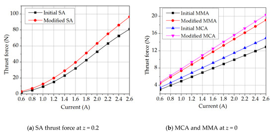 Figure 12 shows the simulated thrust force for the three models before and after the modification process. It is seen that for every model, the re-design process increases the thrust force produced by the actuator. From inspection, the average percentage improvements in the thrust force of the SA, MCA, and MMA models are found to be about 27.5%, 36%, and 48%, respectively, over the considered actuation current range of 0.6–2.6 A with increments of 0.2 A.