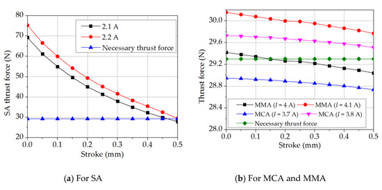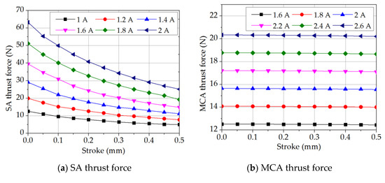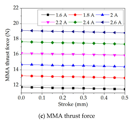 The modified SA, MCA, and MMA models were used to further investigate the effects of the stroke length and excitation current on the thrust force value. In performing the simulations, the z gap of the SA model was increased from 0.2–0.7 mm, while the coil windings of the MCA model and magnet core of the MMA model were displaced through a z gap of 0.0–0.5 mm. For each actuator, the thrust force was calculated at intervals of 0.5 mm along the stroke length. In addition, the simulations were performed at intervals of every 0.2 A in the considered current range (1–2 A for the SA and 1.6–2.6 A for the MCA and MMA). Figure 13 shows the corresponding simulation results. For each actuator, the thrust force increases approximately linearly with increasing current. Furthermore, for each model, the magnitude of the thrust force varies with the position of the movable part (i.e., plunger, coil, or magnet). For the SA model, the thrust force decreases by around 61% on average as the z gap increases from 0.2–0.7 mm. For the MCA and MMA models, the thrust force attains its highest value at the center position (z = 0 mm). However, as the coil or magnet moves away from this position, the thrust force drops by around 0.7% for the MCA model and 1.8% for the MMA model as z increases to 0.5 mm. Overall, the SA thrust force decreases significantly when the position of the plunger is far from the coil holder. For the MCA and MMA models, the thrust force appears to remain constant as the stroke length increases. However, a detailed inspection of the simulation results shows that FMCA and FMMA actually drop within a narrow range of around 0.2 N and 0.3 N, respectively.