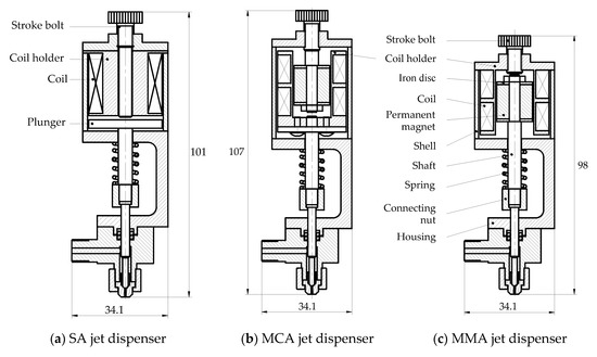 Figure 16 shows the basic configurations and dimensions of the three EMA-based jet dispensers developed in the present study. Note that the actuators are based on the modified design variables shown in Table 3, while the dimensions of the other parts, e.g., the coil holder, the flange, the stroke bolt, and the housing, are based on experience. Moreover, the primary dimensions of the jet valve are indicated in Table 1 and the sub-dimensions of the jet valve components are chosen in such a way as to facilitate the assembly process and ensure proper dispensing operation.