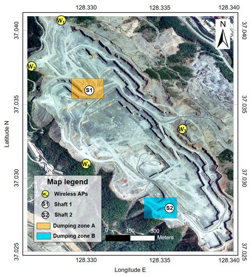 In this study, an open-pit mine owned by Hanil Cement Co., Ltd. in the Republic of Korea (position coordinates: 128° 19′ 58′′ E; 37° 1′ 59′′ N), was selected as the investigation location. The mine produces limestone, from which approximately 8.1 million tons of cement is manufactured each year. Figure 1 depicts an aerial view of the selected open-pit mine. The mine is approximately 2-km long, 700-m wide, and 50-m deep. There are two dumping zones in the mine, each with an ore-processing shaft.