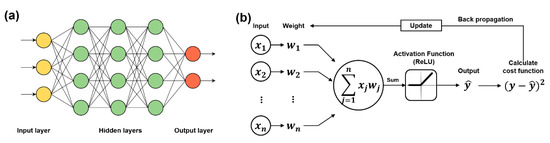 A DNN model comprises three layers: Input, hidden, and output. Figure 4a depicts the DNN-structure model. Each layer comprises multiple nodes connected hierarchically to all nodes in the subsequent layer. The input and output layers are, in general, single layers, whereas the hidden layer may comprise two or more layers. Data features are fed to the input layer, and prediction values are derived from the output layer after processing them in the hidden layers. Figure 4b describes the prediction principle of a DNN model. The weighted sum of nodes is calculated and predicted values are derived using an activation function that exists within each hidden-layer node that receives the weighted sum of nodes as input and converts them into valid values. The most commonly used activation function in regression analysis is the rectified linear unit (ReLU) [66], which produces a value equal to the input if the weighted sum of nodes exceeds or equals zero; otherwise, it yields a value of zero.