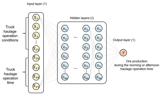As already mentioned, two DNN models were designed in this study to independently predict morning and afternoon ore productions owing to variations in the truck-haulage operation characteristics during different periods of the day. Figure 5 depicts the structure of a DNN model comprising a single input layer, hidden layers, and one output layer. The input and output layers comprise 19 nodes and a single node, respectively. The hidden layer was designed to comprise m nodes in all layers.