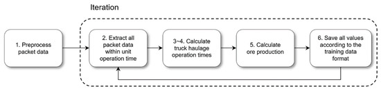 Training data for the proposed DNN model were generated by processing approximately 35.7 million data packets obtained from the mine-safety-management system. The processing was performed over two months—December 2018 and January 2019. The results of packet-data analysis revealed that the morning operation progressed from 8:30 a.m. (relative time: 0 min) to 12:00 p.m. (relative time: 210 min), whereas afternoon operations lasted from 1:00 p.m. (relative time: 0 min) to 4:30 p.m. (relative time: 210 min). The data-generation process employed in this study is explained as follows (refer to Figure 6):