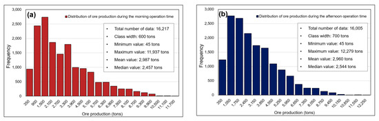 Histogram depicting distribution of ore production during (a) morning and (b) afternoon operation times.