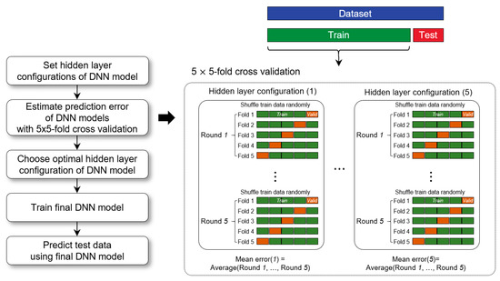 Figure 8 depicts a flowchart of the algorithm developed in this study for DNN model training. This algorithm was developed as a Python script and implemented using TensorFlow (Google; Menlo Park, CA, USA)—an open-source deep learning module. The structure of the proposed DNN model was first configured, and subsequently, prediction error evaluation was performed with 5 × 5-fold cross validation. After choosing the best hidden layer configuration of DNN model, final DNN model training was performed using whole training data. Optimal DNN model demonstrating the lowest prediction error was considered for subsequent utilization. One thousand iterations for DNN model training was performed, and ReLU was used as the activation function. The Adam optimizer was considered as a means to employ the gradient-descent method.