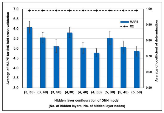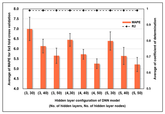 Figure 9 depicts trends observed in the calculated average values of R2 and MAPE, obtained during 5 × 5-fold cross-validation of the morning and afternoon prediction DNN models, in accordance with changes in hidden-layer conditions. As can be seen, the average value of R2 for validation data is equal to 0.99 with increase in the number of hidden-layer nodes, irrespective of the number of hidden layers. MAPE values for validation data decrease with increase in the number of hidden-layer nodes, irrespective of the number of hidden layers. The highest MAPE value for the validation data was 6.08% when the number of hidden layers was three and the number of corresponding nodes was 30, whereas the lowest MAPE value of 4.78% was observed for four hidden layers and 50 hidden-layer nodes.