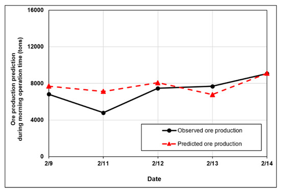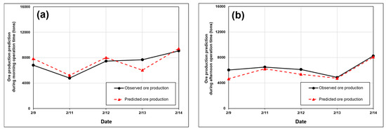 Using the optimum morning and afternoon DNN models, ore-production estimates were obtained for five days in the second week of February 2019; the results are illustrated in Figure 11. Table 10 lists prediction-error values for ore production by date. In regards to morning ore production, compared to actual values, ore-production predictions were found to be overestimated by 14.96%, 9.11%, 7.41%, and 4.10% on 9, 11, 12, and 14 February, 2019, respectively, whereas predictions underestimated by 21.42% were obtained on 13 February, 2019, respectively. Morning ore-production predictions for the five days demonstrated an average absolute error of 11.40%. In regards to afternoon ore production, compared to actual values, ore-production predictions underestimated by 22.92%, 4.41%, 12.23%, 2.68%, and 2.12% were obtained on 9, 11, 12, 13, and 14 February, 2019, respectively. The average absolute error in afternoon ore production for the five days equaled 8.87%, which is lower than corresponding to morning ore production by 2.53%. A comparison between the sum of predicted morning and afternoon ore-production value and the actual daily ore production demonstrated the two values to be nearly identical, and the resulting MAPE equaled 4.17%.