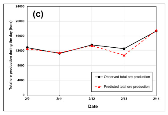 Inference results obtained using optimum DNN models: (a) Ore-production prediction during morning operation (tons); (b) ore-production prediction during afternoon operation (tons); (c) total ore production in a day (tons).