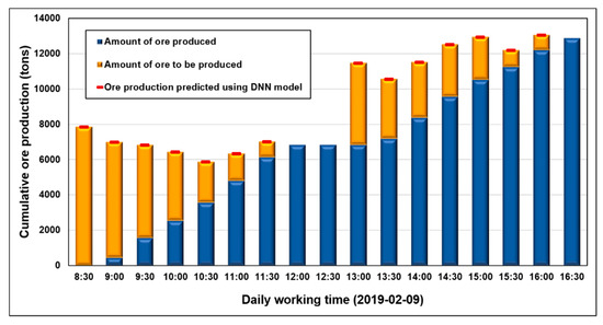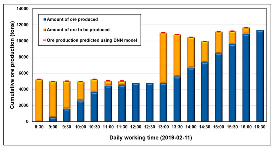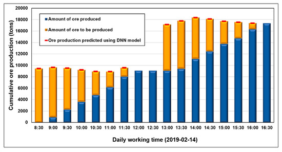In this study, ore-production predictions were predicted every 30 min during the morning and afternoon operation times on 9, 11, and 14 February, 2019 using optimum DNN models to account for changes in haulage-system conditions that occur in real time. Seven ore-production predictions were performed at start times of 8:30 a.m. (0 min), 9:00 a.m. (30 min), 9:30 a.m. (60 min), etc. up to 12:00 p.m. (210 min) during mornings. Corresponding start times in the afternoon were 1:00 p.m. (0 min), 1:30 p.m. (30 min), 2:00 p.m. (60 min), etc. up to 4:30 p.m. (210 min). The number of trucks dispatched equaled the number of 45-, 60-, and 84-ton trucks dispatched for haulage operations at the start time of each prediction. The dumping-zone utilization, average stay time of trucks in the dumping zone, and their average travel time were set using results of statistical analysis described in Section 3.