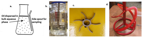 where P = power applied (watts), Np = power number, 𝜌c = density of water (kg/m3), N = impeller rotational speed (rpm), d = diameter of the impeller (m), and V = mass of the continuous phase (kg). Depending upon the type of impeller and the presence or absence of baffles, the appropriate power number correlations were used and calculated. Specifically, for the unbaffled container and paddle impeller, the power number was calculated using the unbaffled condition equations of Kamai et al. [13,14], while for the baffled flask and paddle impeller, the baffled equations presented by Kamai et al. were used. For the unbaffled container and the helical ribbon impeller, the power number was calculated using the helical ribbon equations given in the reference of Furukawa et al. [15]. The amount of power actually applied was not measured in these experiments, but only estimated by the calculation of the power number and use of Equation (2).
