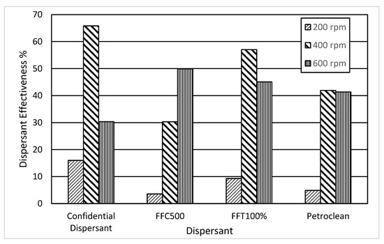 Dispersant effectiveness in a 1000-mL baffled flask (lab scale) at five different impeller 2.5-inch diameter) speeds at the laboratory ambient temperature (approximately 25 °C). (Power number results for this test are included in Table S2).