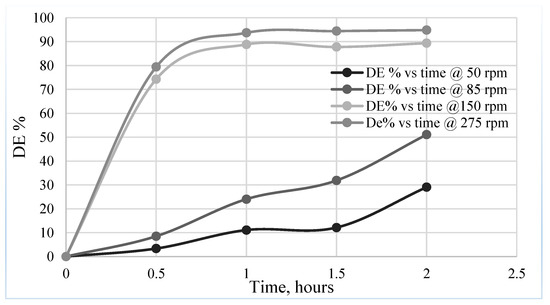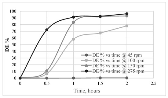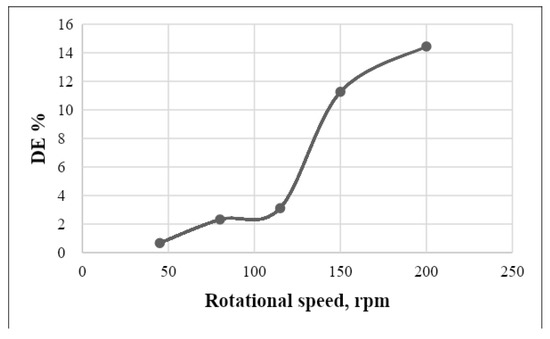 The first graph in this set of experiments presents (Figure 4) the DE levels as measured at five different mixing speeds (impeller mixing, 50 to 200 rpm) in the 1000 mL baffled flask. The results indicate relatively low but generally increasing DE levels, from less than 1% up to 14%, as the speeds rise from the 45 to 200 rpm. All results in this subset of experiments are for DE readings taken after 20 min of mixing.