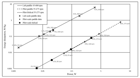 The final figure from this set of experiments depicts all of the DE results from Figure 4, Figure 5 and Figure 6 above, plotted as individual points on a graph of energy dissipation ε versus power of mixing (Figure 8). In this graph, four diagonal lines represent the values of energy dissipation and power at a range of mixing speeds (rpm values), as calculated from the equations presented in Section 2, for three cases of the laboratory scale, pilot scale paddle mixer, and paddle pilot scale helical mixer. Then, the individual DE results are plotted, with the DE levels notated per data point. This graph shows how the helical impeller is able to achieve high DE levels at lower power input values, as compared to the paddle impeller at the pilot scale.