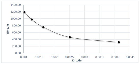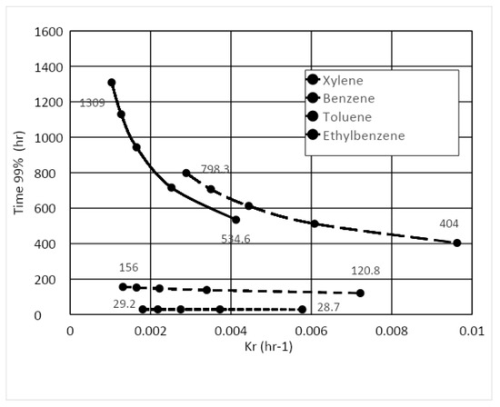 Kr vs. Time for xylene to reach 99% biodegradation (Dp = 500 μm).