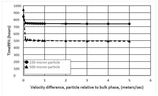 Additional model runs for xylene were completed using advective transport (Equations (13)–(16)) as compared to diffusive transport (Equation (12)) only. The results presented in Figure 15 depict the time to 99% biodegradation as a function of advection velocity over the range from 0 to 5 m/s, for the two different particle sizes of 150 and 500 µm. The results indicate that the positive effect of advection mass transport is greater at the larger particle size of 500 µm (biodegradation time decreases from 940 h to 490 h), and much less for the smaller particle size of 150 µm (biodegradation time decreases only from 840 h to 740 h).