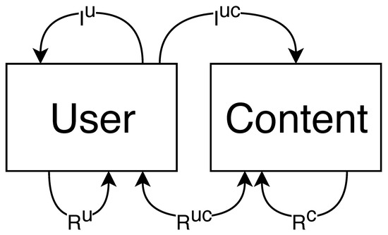 Figure 1 provides a graphical representation of the possible links between entities of the two available types. Users may interact (i) with other users () or with content ().
