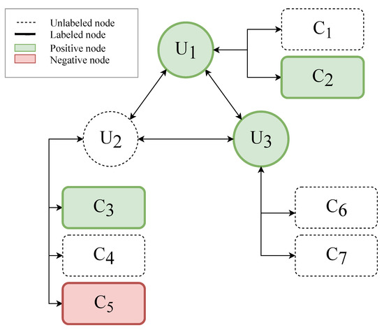 The sentiment classification task consists of finding all the sentiment labels for users () and content () in a given social context, where the labels of a sub-set of users () and a sub-set of content () are known in advance. The social context is made up of a set of content (C), a set of users (U), relations between both users and content (R), and interactions between users and content (I). This is illustrated in Figure 2, where relations and interactions are simplified as undirected edges between nodes (i.e., users and content). For the sake of simplicity, we will only consider two possible labels: positive and negative. However, the model can be used with an arbitrary number of labels.