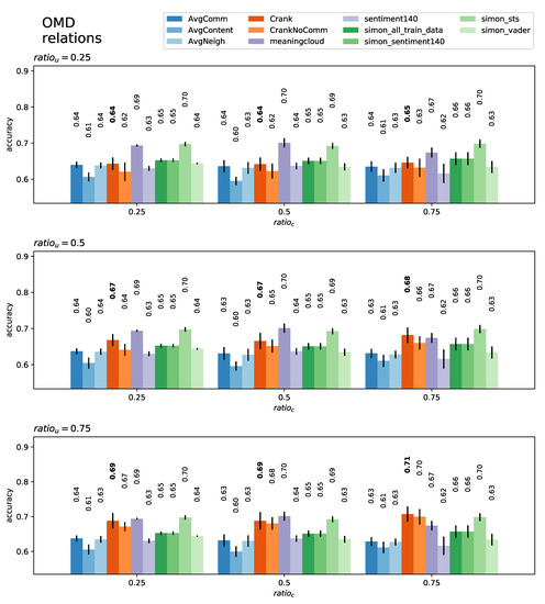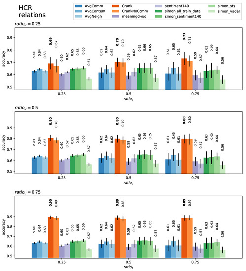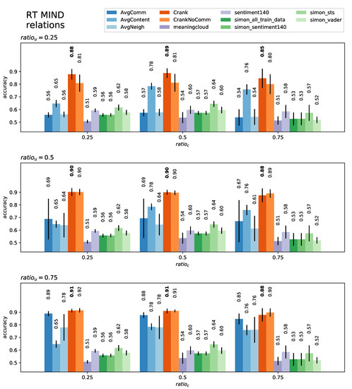 Secondly, we performed a similar comparison for content-level classification. We compared the following approaches to the Sentiment140 baseline. The calculated critical difference for this case was . The results were that only CRANK, CRANK without communities, and Simon trained with the STS dataset were better than the baseline (Table 5). Unfortunately, we could not reject the null hypothesis for CRANK and Simon STS alone at the desired level of confidence, given the number of datasets. Nevertheless, if we reduced our test to the scenarios with the RT Mind dataset at different ratios of and , the null hypothesis could be rejected with .