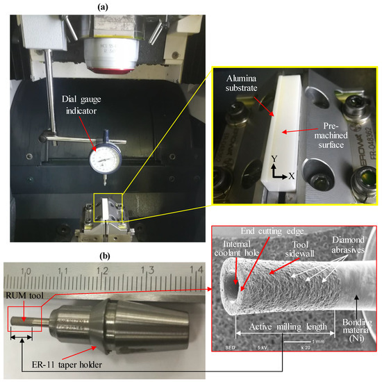 In order to remove the chamfer edges from the workpiece, face milling was previously conducted the surface flatness was measured by the dial gauge indicator (see Figure 2a). RUM tools provided by Schott Company, Germany are applied in the experiments as shown in Figure 2b. The used tools are nickel-based materials bonded with diamond abrasives with a mean diameter size of ≈44 µm (D46, mesh size of 325/400), which are recommended by the Schott Company for machining smooth surfaces on ceramic-based materials. All specifications of the used tools can be found in Table 2. The size of the micro-pockets milled in this research was 6 mm (length) × 6 mm (width) × 0.3 mm (depth), as shown in Figure 1b. The material adopted in the current study was alumina (Al2O3 99.99%) from CeramTec, Germany. It is a polycrystalline high purity alumina, which is mainly used in medical applications [30]. Other applications of the used alumina ceramic can include hybrid circuits, high-strength ceramic tools, wear-resistant, corrosion-resistant parts, etc. [31]. Each of the alumina samples was under the form of block dimension 50 × 50 × 10 mm3 in size. The specifications of the used Al2O3 material are listed in Table 3.