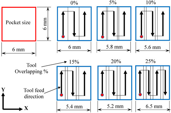 The experiments performed on the alumina (Al2O3) substrate were divided into two main tests, (i) tool overlapping test and (ii) tool path strategies test. In the tool overlapping test, the effect of several tool overlapping percentages (0%, 5%, 10%, 15%, 20% and 25%) on the surface quality and profile accuracy of the milled micro-pockets were examined. The tool overlapping was calculated as a percentage of the RUM tool diameter (2 mm). For example, the 10% overlap was equal to 0.2 mm ((10% × 2 mm)/100). Figure 3 shows the schematic diagram of the tool overlaps used in this test. It should be noted that surface roughness in terms of Ra and Rt, surface morphology and pockets profiles were the three outputs considered during the overlapping test because all the three outputs play a vital role in the micro-pockets functioning [32,33].