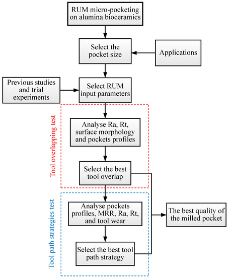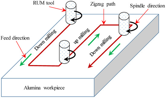 It can be concluded from the above literature review that very few research studies have been conducted on the micro-milling of Al2O3. According to the author’s knowledge, no research has been found on milling pockets in Al2O3 by using RUM. Moreover, the most of available studies have been limited to investigate the effects of RUM input parameters such as feed rate, spindle speed, depth of cut, frequency, amplitude and coolant pressure on the cutting force, edge chipping and tool wear of the fabricated holes and/or channels. Furthermore, the effect of tool overlapping and tool path strategies on the surface quality and dimensional accuracy of the machined parts have never been investigated in all studies conducted for the RUM of Al2O3 ceramic. Moreover, the effect of the tool overlap and tool path were not considered in the studies documented on the fabrication of the microchannels through RUM [17,18]. This is because, in those investigations, the selected sizes (widths) of the fabricated channels were equal to the diameter of the used RUM tools. On the contrary, the tool overlap and the tool path strategy are important parameters while machining the pocket. In contrast to the existing literature, the current study is aimed to analyze the significance of tool overlapping and tool path strategies on the surface roughness, the profiles, surface morphology and the MRR of the fabricated pockets. Scanning electron microscopy (SEM) is used to investigate the types of RUM tools wear.