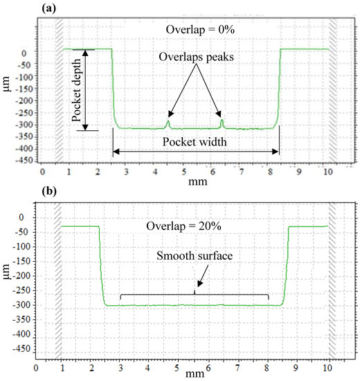 Typical example of the pocket’s profiles machined at (a) 0% tool overlapping and (b) 20% of the tool overlapping.