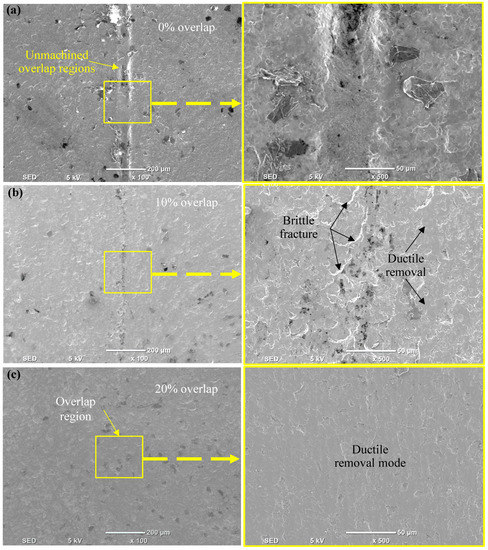 The SEM images shown in Figure 9 present the surface morphology of the pockets machined on the alumina bio-ceramic material at a different percentage of the tool overlapping. It can be observed from Figure 9 that the surface morphology of the machined pockets changes with varying the percentage of the tool overlapping. The SEM images indicate that, in agreement with observations documented in [1,17] whereas in RUM of ceramics, two material removal modes exist: brittle fracture and ductile fracture. Brittle fracture is observed as tear-outs forming on the pockets surfaces machined at a low percentage of overlapping (0–10%) as shown in Figure 9a,b. The presence of smooth areas where the ductile fracture mode seems to be dominant resulting in a smooth surface of the machined pockets at a higher percentage (20%) of the tool overlapping (see Figure 9c). It should be noted that, since there is no difference between the values of Ra and Rt obtained from the overlapping of 20% and 25%, and in order to reduce the machining time, the overlapping of 20% was selected and kept constant in the tool path strategy test.