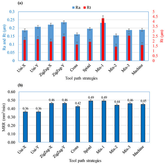 (a) Effects of tool path strategies on Ra and Rt and (b) effects of tool path strategies on MRR.