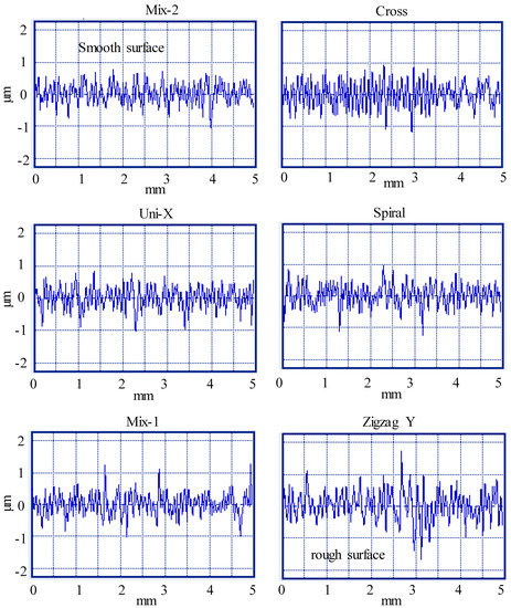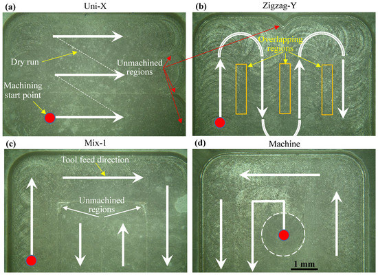 To further improve the roughness values obtained in the overlapping test, different tool path strategies have been tested. Table 5 presents the experimental results of the significance of tool path strategies on the surface roughness and MRR of the milled pockets. Again, the machining conditions (see Table 4) were kept constant in this test. The three outputs (Ra, Rt and MRR) of the pockets milled at ten tool path strategies can be also shown in the form of bar charts in Figure 10. Again, in this test, the values of Ra and Rt have been taken across the tool feed for all the machined pockets. Figure 11 presents the 2D profiles of the surface roughness for six pockets machined by using six different tool path strategies. The selected profiles in Figure 11 were arranged to start from a smooth pocket surface machined with the cross path strategy to the final with rough surface machined under the Zigzag-Y strategy. Figure 12 shows the microscopic images of the machined pockets. It can be seen that pockets machined at the zigzag milling strategy have a rough surface (higher values of Ra and Rt) comparing to the pockets milled at either Uni-X or Uni-Y strategies in which smooth surfaces can be obtained (see Figure 12a,b). This is because in the zigzag milling strategy two types of milling modes take place; (i) up milling in which the tool rotates at the opposite direction of the feed and (ii) down milling in which the tool rotates along with the feed direction (see Figure 13). The alternate change of cutting mode, which is along with the spindle direction and then versus it, resulted in a deviation in cutting speed and accordingly produces a rougher surface. This observation also matches with the results documented in [32]. Due to the aforementioned reason, the uniform surface quality can be observed at the spiral and cross path strategies in which the cutting speed was kept uniform and results in a more homogeneous surface by using only one direction cutting. In contrast, a rough surface with un-machined regions (high value of Rt = 4.31 µm) was observed on the surface of the pockets machined at Mix-1 strategy, which was a mix between the spiral and zigzag strategy (see Figure 12c). The second pass of the Mix-2 strategy was carried out in one direction (see Figure 4), this results in a smooth surface comparing to rough surface obtained at Mix-3 and Machine strategies in which the cutting was carried out at different modes. Although the smooth surface of the milled pockets can be produced at Uni-X and Uni- Y strategies, they have the lowest MRR. This is because of more time consumed in dry runs (the tool always moves up and goes to the beginning of the line, see Figure 4). Moreover, the un-machined regions (see Figure 12a) were excluded from the volume of the machined materials. The maximum MRR (0.49 mm3/min) can be achieved at the spiral and Mix-1 strategies. It can be found that the values of Ra and Rt in both cross strategy (0.162 µm and 1.643 µm) and Mix-2 strategy (0.155 and 1.432 µm) were close to each other. This is because both strategies had the same finishing path (second pass). Among all tool path strategies, the minimum value of Ra and Rt can be achieved at the Mix-2 strategy, in which the zigzag path was applied to the first pass, while the second pass was carried out by using Uni-X strategy. Figure 14a,b show samples of the surface profile and the surface morphology of the pockets machined at the Mix-2 strategy.