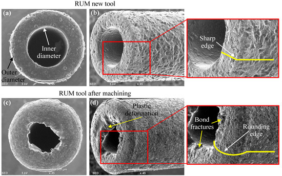 In this study, two RUM tools were used to machine all pockets. The first tool is used until the dimensional errors of the machined pockets reach 5%. Figure 15 shows a comparison between the new and the used tool. Sharp cutting edge along with uniform inner and outer radii can be easily observed in the new tool in Figure 15a,b. On the other hand, as depicted in Figure 15c,d bond fractures, tool edge rounding, and plastic deformation can be detected, these types of tool wear were also documented in [34,35]. The plastic deformation, which happened due to the high pressure applied to the tool end face (see Figure 15d), can partially block the internal coolant. It should be noted that the calibration system built in the DMG was used to measure the tool length after fabricating each pocket. Moreover, the tool rounded edge can affect the pocket’s geometry. Therefore, in this study, the dimensional accuracy of the machined pockets was taken into consideration.