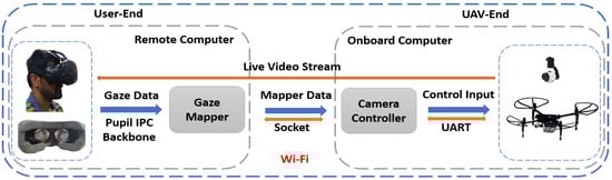 - User-End: Pupil Lab’s APIs were used to roll our GazeMapper (Algorithm 1) in Python. OpenCV was used to stream real-time video from the UAV’s camera to the HMD.
