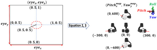 When the user is ideally looking at the center of the field of view, the gaze value will be (). The implemented GazeMapper receives these eye-tracker values to map to the corresponding camera pitch () and yaw () movements, as shown in Figure 3.