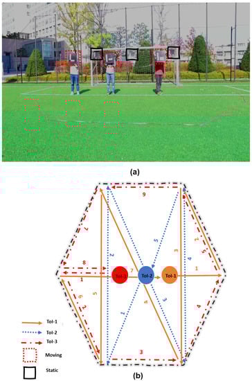 Experiment 2: A moving target-based experiment with a total track length of 37.1 m was designed in an outdoor environment (Figure 5) by considering three ToIs with an objective to maintain the ToI in the center of the view. Three ToIs moved in their unique predefined pattern (Figure 6). The experiment was carried out with two variations: