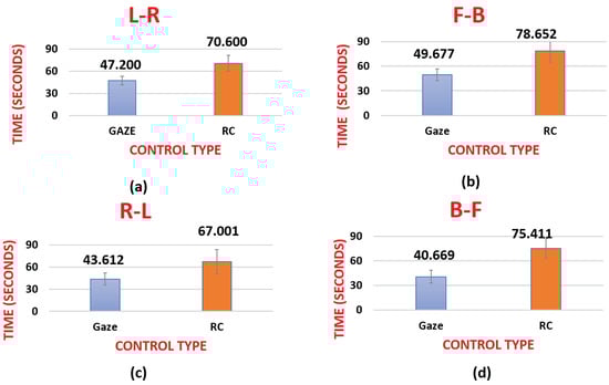 Further, the paired t-test showed a highly significant difference in the time to complete the experiment using GazeGuide and RC. For variation 1 (L-R), , , variation 2 (F-B) , , variation 3 (R-L) , , and variation 4 (B-F) . Overall (Figure 8), we can clearly see that when using GazeGuide, the participants significantly took less time to complete the experiment than when using RC.