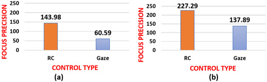 Figure 9 represents the focus precision during the tracking of each ToI. It clearly shows that in the case of RC, more deviation occurred because of the abrupt movement/control of the camera. In contrast, GazeGuide provided a very smooth maneuvering functionality to control the camera in a natural and effortless manner. Hence, the achieved focus precision was very less (540 pixels was the maximum observed focus precision) than RC (940 pixels was the maximum observed focus precision).