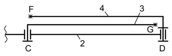 The mechanism has three driving elements: the first is element 1, which drives cross 2 and the ACDE element, the second is the CG element (Figure 7—the view from above the ACDE element), and there is an engine in C, rotating the CG element, so that G describes the G circle in Figure 6. While the CG element draws its circle, a third driving element, DF (Figure 7) draws the F circle in Figure 6, in D with another electric engine. When the two elements 3 and 4 have drawn their circles, they return to the original position, stopping their movement, so the AC element will rotate to the next position. These movements will be connected by sensors that control the starting and stopping of the engines in C and D, depending on the position of the cross.