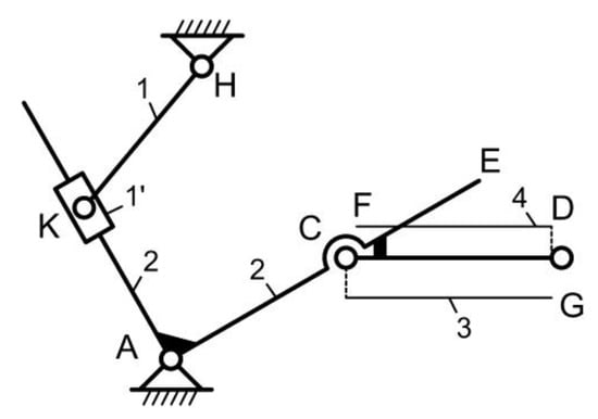 The mechanism in Figure 6 has a higher pair in K, therefore for the structural study, this joint was replaced by element 1′ (Figure 8) and joints K (1,1’) and K (1’,2). Elements similar to the more explicit solution in Figure 7 are represented in the CDGF area. The structural diagram of Figure 9 was obtained in this way.