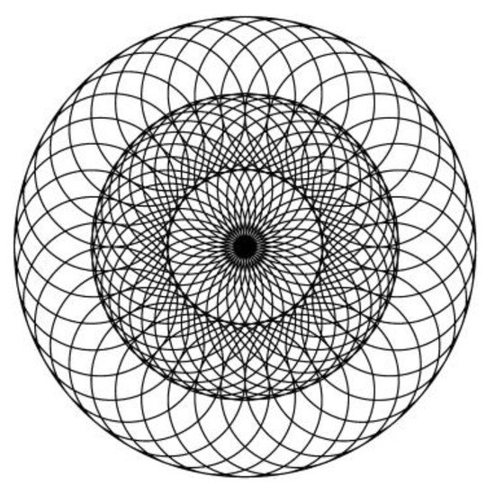 In Figure 4, we show the central circle and the six circles. We had already obtained an aesthetic image, which is a part of the image from Figure 2. Circles with centers in points Di were further drawn, and also the outer circle described by the point E, resulting in the final image in Figure 5 (image with 13 circles), identical to that in Figure 2 (but rotated). Each of these images also has the same number of 18 petals (the intersections of circles marked with gray in Figure 2). The images in Figure 4 and Figure 5 were obtained with Gwbasic programs.