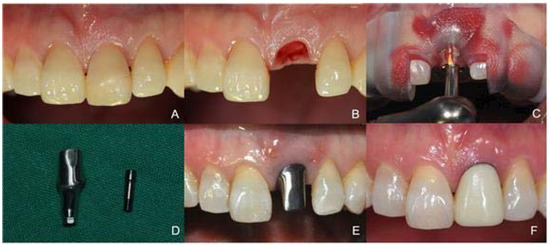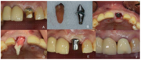 The Immediate Post-Extraction Implant Placement Using Guided Surgery with an Immediate Provisionalization (Case 1). (A) Before the Extraction of the Unrestorable Tooth, (B) After the Atraumatic Tooth Extraction, (C) Drilling with the Positioning of the Surgical Guide, (D) A Pre-Fabricated Customized Titanium Abutment, (E) The Abutment Supporting the Original Anatomic Contour of the Gingiva, (F) The Provisional Restoration was Cemented.