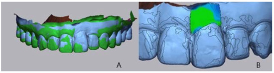 The Evaluation of the Labial Tissue Volume Change. (A) The Superimposed Digital Study Cast Model and Follow-Up Cast, (B) The Area of Interest, Where the Green Area Means No Change, and the Blue Area Means Loss of Volume.