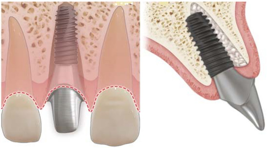 The replacement of an unrestorable tooth with a single implant-supported prosthesis is a treatment with predictable and successful outcomes. The esthetic outcomes, as well as the functional and physiologic outcomes, are quintessential in the treatment of the anterior maxilla area [1,2,3,4]. After a tooth is extracted, the loss of the periodontal ligament lowers blood supply to the alveolar bone. The buccal plate of the alveolar bone is particularly affected, and this ultimately yields poor esthetic outcomes [5]. It is important to maintain the architecture of the fresh extraction socket for the immediate post-extraction implant placement in the esthetic zone [6,7]. Many studies have reported that an immediate implant placement and provisional restoration provide acceptable changes in the soft tissue and esthetic outcomes [8,9,10,11,12,13]. A correct fixture positioning, grafting technique, and immediate provisional restoration help achieve successful results in the esthetic zone [7,14,15,16,17,18].