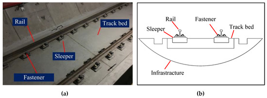 The monolithic track bed is the most common track structure of subways in China, which is investigated in this paper. It is comprised of CHN60 rails, fasteners, sleepers, the track bed and the infrastructure, as shown in Figure 1. The rail is mounted on sleepers by fasteners. Because the track bed connects the sleepers and the infrastructure rigidly, the sleepers, the track bed and the infrastructure can be considered as a whole. The vertical fastener stiffness of subway lines in China is generally less than 50 kN/mm [17].